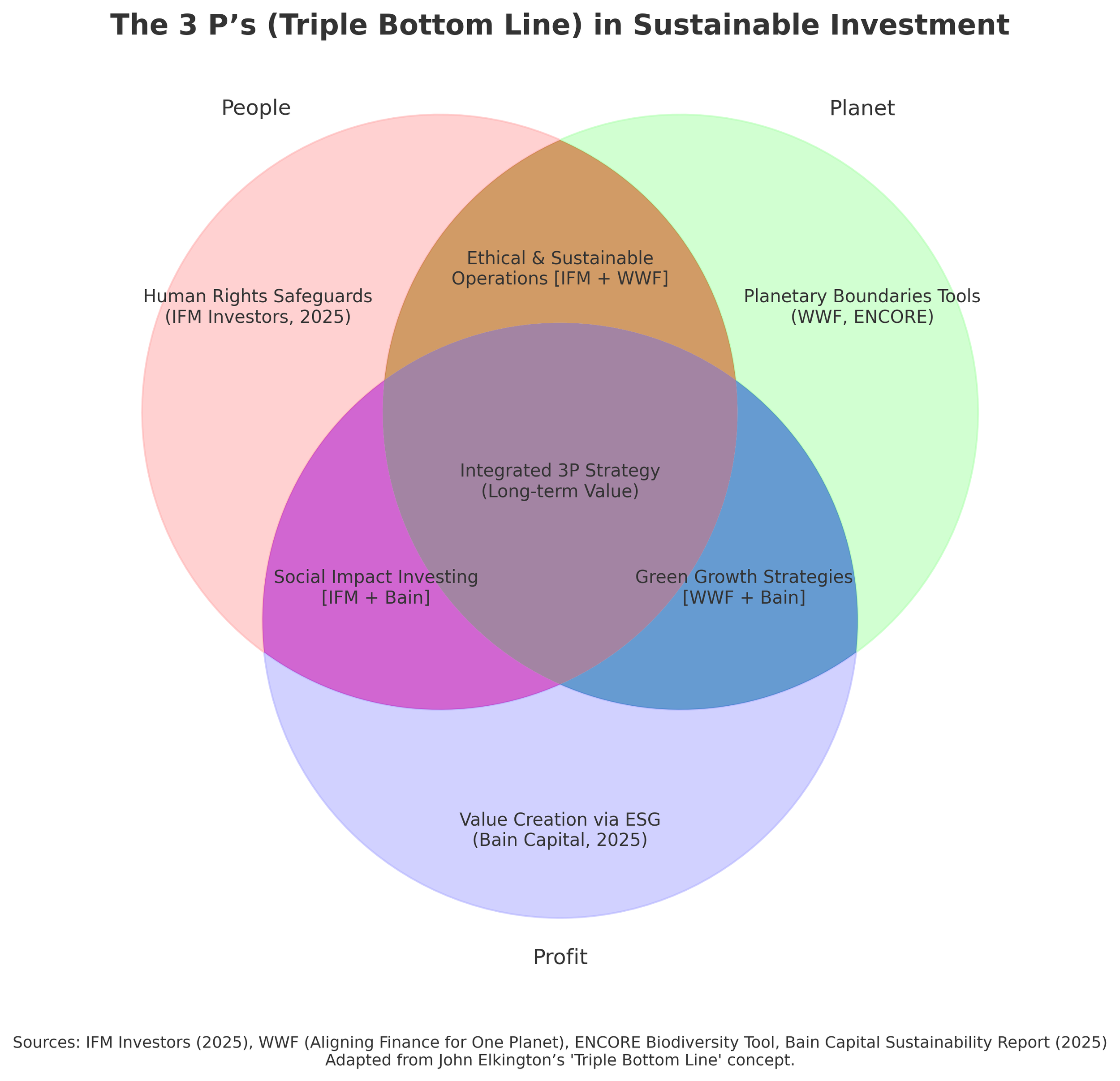 The lesson is clear: People, Planet, and Profit are not competing priorities—they are mutually reinforcing pillars of long-term success. IFM’s human rights safeguards, WWF’s planetary boundary metrics, and Bain’s sustainability-driven value playbook all point to the same conclusion: